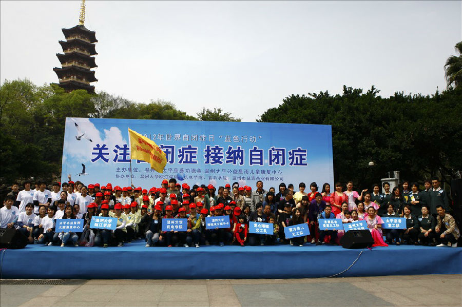 4月2日早上9:00-11:00,中心在松台广场举办大型社会倡导活动“关注自闭症•接纳自闭症”,当天早上共有8支义工队伍参加,共300余人一起倡议。并在签名栏上签下了自己的姓名,表达对自闭症儿童的关注与关心。温州大益茶道院全体学员为中心捐赠现金2万元,更有几个不留姓名的小朋友在现场献出自己的一份爱心。志愿者们利用这个节假日,度过了快乐并有意义的一天。