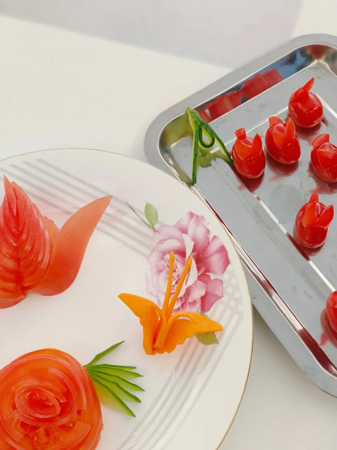 紧接着,我们便进入到了备受期待的实际操作环节。桌上早已提前备好所需的新鲜水果和可口蔬菜。在金老师的耐心指导下,现场秒变欢乐制造工场。家长们生疏且细致地雕刻着他们的作品,不用多久,一只只栩栩如生的小兔子便闪亮登场。